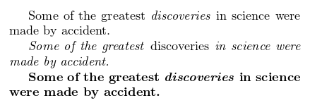 Another very useful command is the \emph{...} command. What the \emph command actually does with its argument depends on the context - inside normal text the emphasized text is italicized, but this behaviour is reversed if used inside an italicized text- see example below: