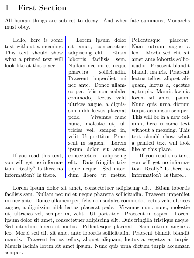 Two-column documents can be easily created by passing the parameter \twocolumn to the document class statement. If you need more flexibility in the column layout, or to create a document with multiple columns, the package multicol provides a set of commands for that. This article explains how use the multicol package, starting with this basic example: