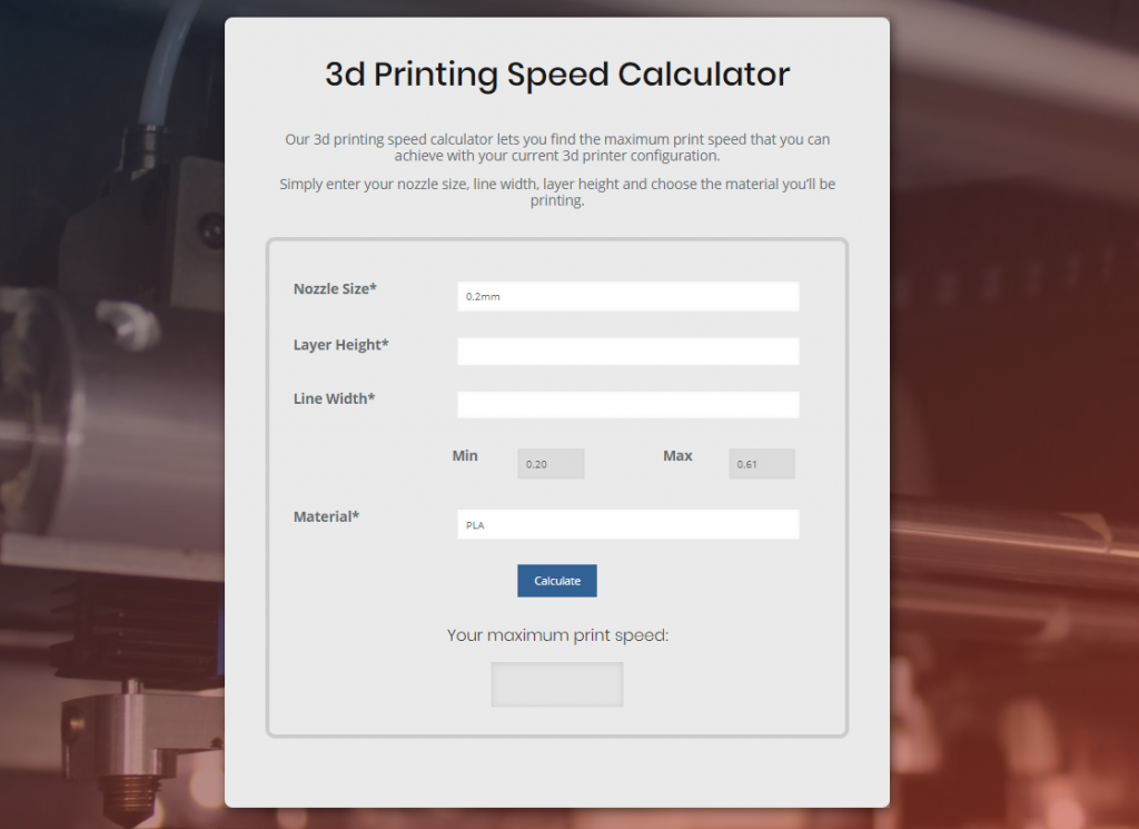 All these results were broke down into charts which are used in this calculator. Once you enter the desired layer parameters, the maximum printing speed is calculated. From this point, the user can choose a lower value if desired. The suggested flow is then adjusted based on the slower speed.