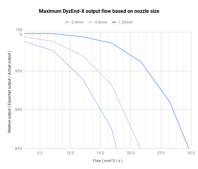 There is always a small slipping in the filament from the extruder. The faster you go, the greater is the slipping. Below is an example taken from the DyzEnd-X with few nozzles. You can see that the 1.20mm nozzle can output a lot more flow than the other nozzles. Also, the efficiency is decreasing by an exponential rate based on the output flow.